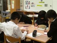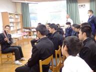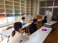 今日の2年生の美術の授業は、先週に引き続き、丸太を削り、木製のスプーンをつくる作業を黙々と続けていました。その様子は”師匠と三人の弟子”といった感じでした。