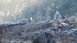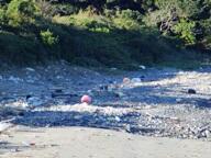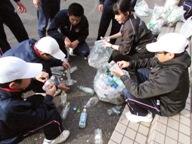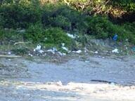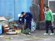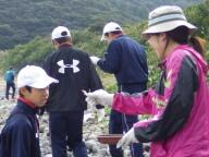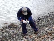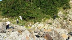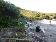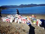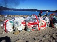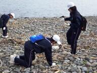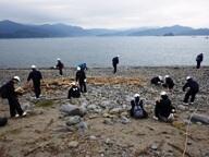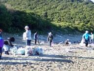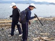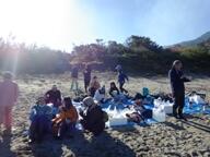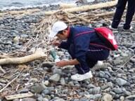 峠を下り浜へ到着したら清掃活動。多くの物が漂着していてみんなでゴミを集めました。