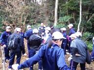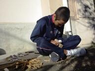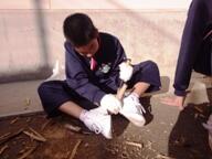 2年生の美術の授業では、学校の裏山にあった木でスプーンを作っています。直径が20cm程度の丸太をのこぎりやのみ、小刀などを使って形作ろうとしています。完成にはまだまだかかりそうですが、3人の男子は黙々と作業を続けています。
