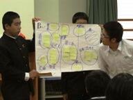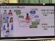 人権教育担当の職員が中心となって授業をすすめ、各グループについた職員が子どもたちの話し合いを支援しながら行い、「いじめを未然に防ぐ方法」や「対処法」をワークショップ形式で深く考えました。