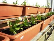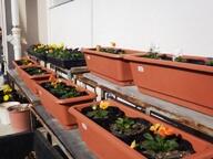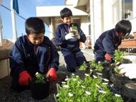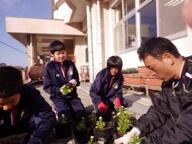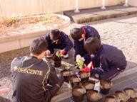 学校では春に向けて花の準備が始まりました。1年生の技術の授業は栽培について勉強しています。先日は土をふるい、腐葉土と混ぜ、土作りをしました。今日は準備しておいた植木鉢にノースポールとパンジーの苗を植えていきました。