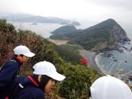 今日は全校生徒で遠見場(とんば)山への登山と清掃活動を兼ねて島野浦島トレッキングを行いました。昨日は天気が悪く、今朝も曇り空で小雨も降っていましたが、気象情報では天気は回復傾向だったので実施しました。