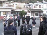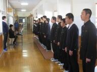 島野浦中学校の卒業式は3月16日(木)、ちょうど2週間後です。卒業式で歌う歌を、帰りの会の時間に廊下で練習しています。3年生の学級担任の先生も、感動のある卒業式にするために、熱心に指導しています(担当教科は社会科です)。伴奏は国語の先生です。