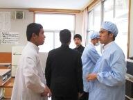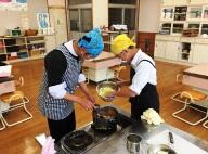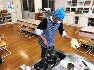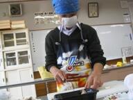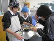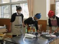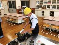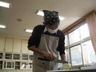 先週の1年生に続き、今日は2年生が調理実習でした。男子生徒3名が慣れない手つきで包丁を使い、調理していました。