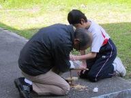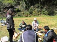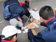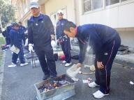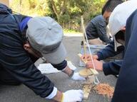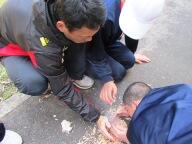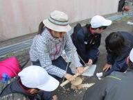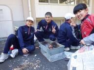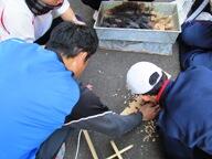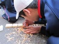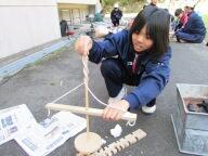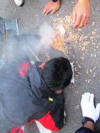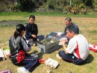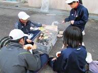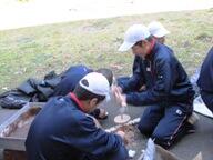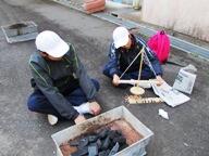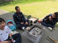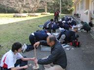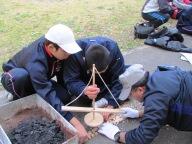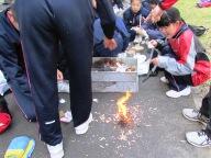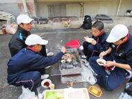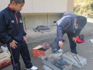 学校に戻ってきたら昼食の準備です。昼食はバーベキュー。しかしマッチやガスは使いません。火おこし機をを使って火種を作り、それから炭に火をつけます。どの班も無事に火がおこり、バーベキューを始めました。