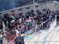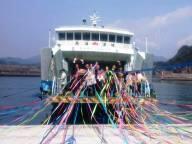 島を離れる先生の手元には色とりどりの紙テープ。港には蛍の光が流れています。午前11:00。出港の時刻です。島を離れる先生方の目には涙があふれ、いつまでも手を振っています。港には保護者や生徒だけではなく、島の方々など、多くの人が、よい思い出と一緒に島を離れていく先生の姿をずっと見送ってくださいました。
