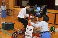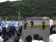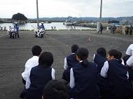 小学生高学年から中学生は、自転車シミュレーションによる安全確認、小学生低学年は、横断歩道の渡り方を指導していただきました。後半は、マリン球場駐車場に場所を移し、白バイの慣熟走行、パトカー乗車など警察の仕事を身近に感じることができました。