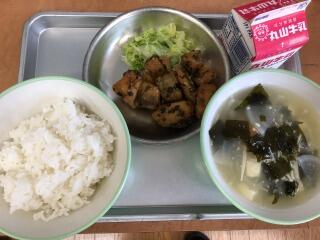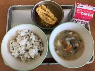 【わかめご飯 牛乳 千切り大根入り厚焼き玉子 そえ野菜 ぶた汁】