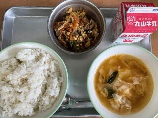 【白ご飯 牛乳 豚肉とじゃがいものきんぴら 塩こうじスープ】