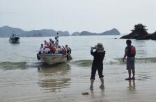 島の北側に海上タクシーで移動し、小型の船に乗り換えて浜に上陸しました。今回「シーカヤック教室」が行えたのは島の方々の協力のおかげです。ありがとうございました。