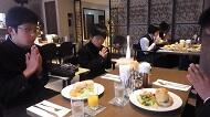 【 南港行きバス停 】 【 船での夕食 】 【 明石海峡大橋 】