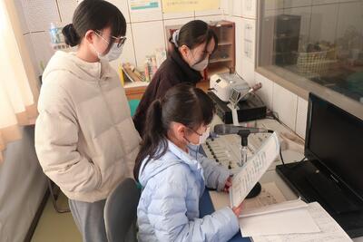 ここでは、3人の先生方が、小学校・中学校のいろいろな事務関係の仕事をしています。来客があった時の初めの対応も、事務の先生の仕事です。今は年度末で、とても忙しそうでした。