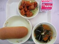 コッペパン 牛乳 わかめスープ ヤンニョムチキン 添えキャベツ