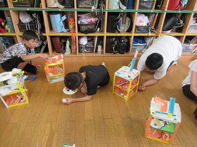 トイレットペーパーの芯やお菓子の空き箱など、身近な材料が素敵なおもちゃに大変身。2年生は、遊び方を丁寧に説明したり、壊れたおもちゃをその場で修理したりと、頼もしい姿を見せてくれました。