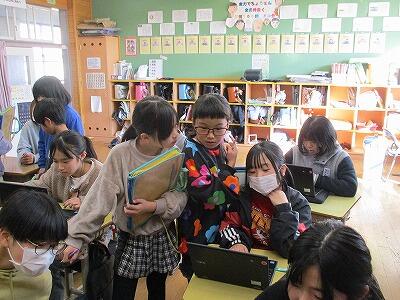 18日(水)に、卒業式に向けた授業(4校時)を6年生にしました(写真参照)。現物大の卒業証書を一人一枚配付し、国語辞典で意味を調べました。口々に予想した意味をつぶやいていました。