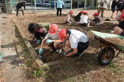 本日は、3時間目に1・6年生、5時間目に3・4年の2学年ずつで活動を行いました。上学年が下学年をサポートしながら、協力して丁寧に花植えを行うことができました。明日は、2・5年生が花植えを行います。