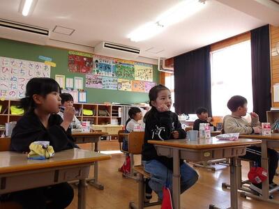 3学期に入り、どの学年も朝の時間を利用して、卒業式の歌の練習をしていますが、1、2年生は週に1回、合同で歌の練習をしています。一緒に練習することで口の開け方や声の出し方などお互いに刺激をもらい、練習のたびに上手になっています。お世話になっている6年生のために心を込めて練習しています。
