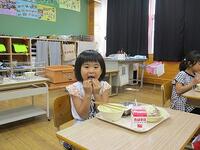 今日 はトマトについてのお話 しです。今日 は中学 2年生 がリクエストしたトマトを使 った献立 です。技術 という教科 で、気温 や水 、季節 などの条件 の違 いによって作物 がどのように変化 するのか、を勉強 するために学校 の花壇 でミニトマトを育 てました。トマトの赤 い色 はリコピンという色素 によるもので、がんや老化 を予防 する働 きがあります。リコピンは、生 で食 べるときに比 べ油 と一緒 に食 べる方 が吸収率 が高 いとされています。いろんな食 べ方 でトマトを味 わいましょう。