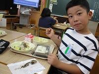 今日 は鮎 の塩焼 きについてのお話 です。みなさんは「鮎 やな」を知 っていますか?鮎 やなとは、成長 して卵 を産 むために川 を下 る鮎 の習性 を利用 して、川 をせき止 めてその一部 に流 れ口 を作 り、「落簀 」と呼 ばれる竹 のすのこの上 に落 ちた鮎 をとる、伝統的 な漁法 です。延岡 の鮎 やなはとても有名 で、例年 10月中旬 に完成 します。鮎 はカルシウムやビタミンなどをたくさん含 む、栄養満点 な食材 の一 つです。今日 は給食 センターのオーブンで、約 170 人分 の鮎 の塩焼 きを調理員 さんが焼 いてくれました。骨 には充分気 を付 けて食 べてください。魚 の命 と、給食 ができるまでに携 わってくれた様々 な方 に感謝 していただきましょう。