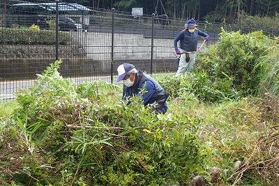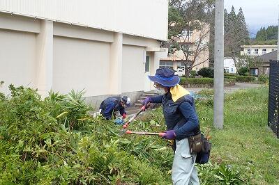 10月4日(火)に3名の学校技術員が来校され、旧校長室から体育館、プールまでのフェンス周辺の除草作業を行っていただきました。