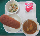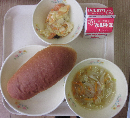 コッペパン、牛乳、五目スープ、たこ焼き風