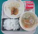 ごはん、牛乳、野菜スープ、タンドリーチキン、添え野菜