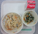 ごはん、牛乳、かきたま汁、めひかりの唐揚げ、カリカリ和え