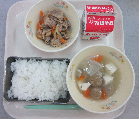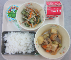 ごはん、牛乳、けんちん汁、大豆とかえりの揚げ煮