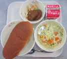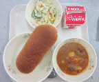 コッペパン、牛乳、オニオンスープ、鶏肉と大豆のトマト煮