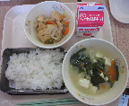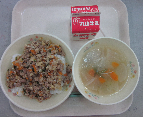 ごはん、牛乳、米粉の団子汁、鉄火みそ
