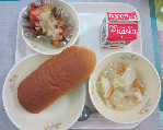 コッペパン、牛乳、ジュリエンヌスープ、魚のマヨネーズソースかけ
