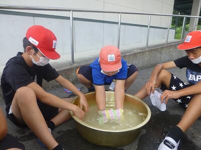 家庭科の授業で「快適に過ごすため」に洗濯の学習をしました。今回挑戦したのは、手洗いですので大きな衣類は難しい・・・ということで、日頃使っているハンカチ洗いに取り組みました。全体をもみ洗いし、細かな汚れはつまみ洗い、絞る時にはねじり絞りと、いろんな技を駆使して洗いました。