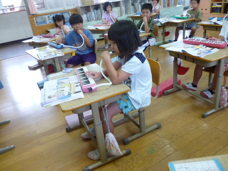 1年生は、音楽の時間に、初めて鍵盤ハーモニカを吹く学習をしました。
