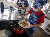トマト、ピーマン、ナス、オクラ。これらの一生懸命育ててきた野菜を収穫し、早速カレー作りのスタートです。 調理実習はまだ2回目でしたが、5年生二人で作業を分担しながら、洗う・切る・炒める・煮る工程を順に手際よくすすめていきました。