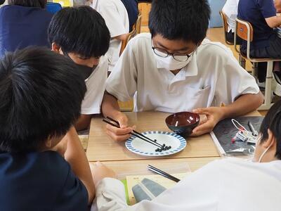 中学2年生の家庭科の時間に「お箸の使い方」について学習しました。個人に合ったお箸の長さをチェックし、「持ち方」や「動かし方」の再確認をしました。