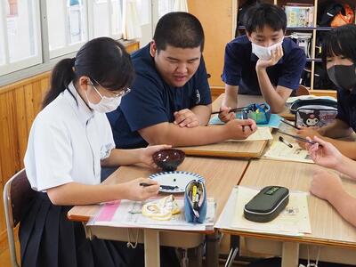 修学旅行2日目、最初の目的地である竹細工伝統産業館では、竹鈴作りを行いました。基本となる竹鈴に、自分たちの手で色付きの竹ひごを上下に編み込んで作っていきました。作業している部屋がしんとなるほどの集注っぷりで、それぞれ模様の異なる竹鈴が完成しました。その後は、竹細工の見学なども行いました。