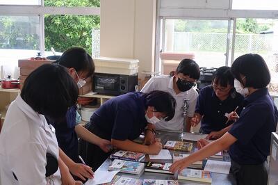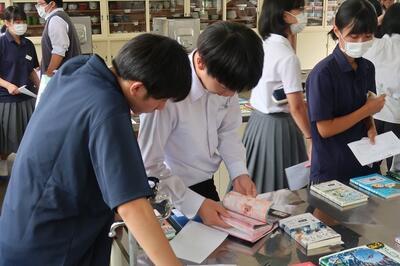 7月20日(木)に、実際に本を手に取りながら購入希望をとる「選書会」を行いました。業者の方に学校に本を持ってきていただき、各学年ごとに生徒が選書を行いました。様々なジャンルの本があり、生徒たちも興味津々。自分が読んでみたい本を希望調査票に記入していました。この選書会をきっかけに読書欲が高まり、読書をする生徒が増えることを期待しています。
