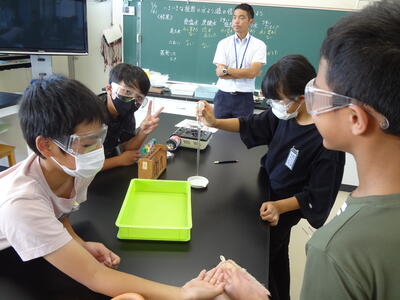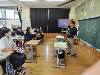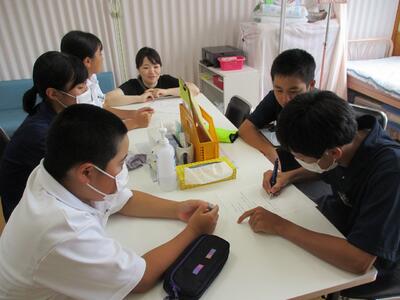 中学3年生で健康と環境「飲料水の衛生的管理」の保健の授業を行いました。4つの水の中から安全だと思う水を選びましょうという課題に対し、友達と話し合いながら選ぶ中で「透明だから安全だ!」という意見や「美味しそうな色だから安全だ!」「色がついているから危ない!」など様々な意見が上がりました。その他には、体内での水の働きや、日頃飲んでいる水がどのようにして確保されているかなどを学ぶことができ、普段考えないであろう飲料水について考えることができました。