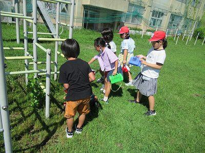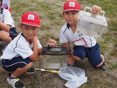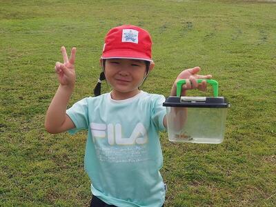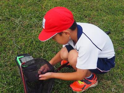 はじめは、虫取り網から虫かごに移す時にうまくできず、逃がしてしまうこともありましたが、何回も捕まえていくうちに上手になり、虫かごの中がいろいろな虫でいっぱいになりました。