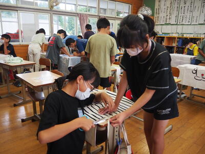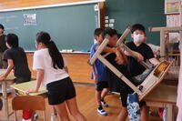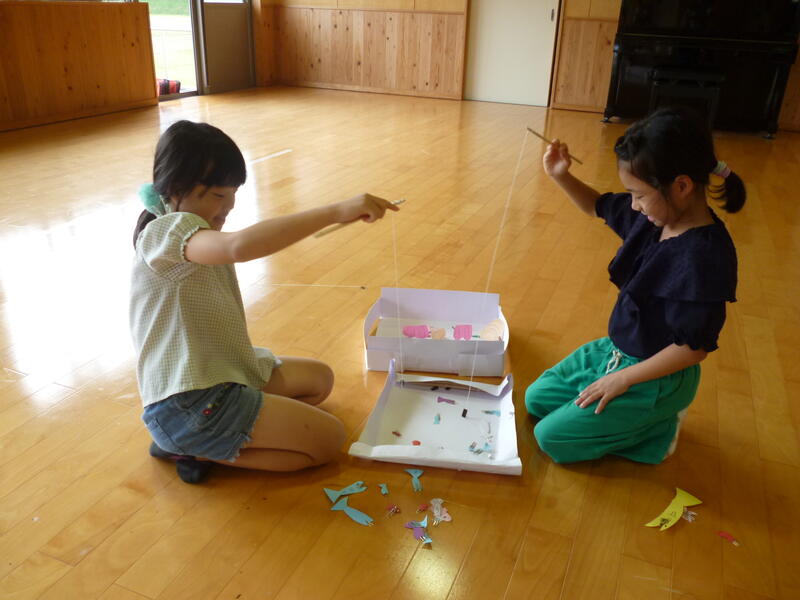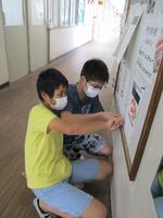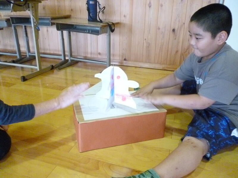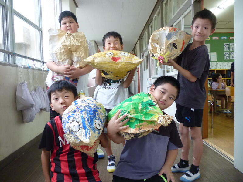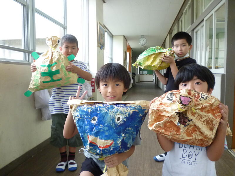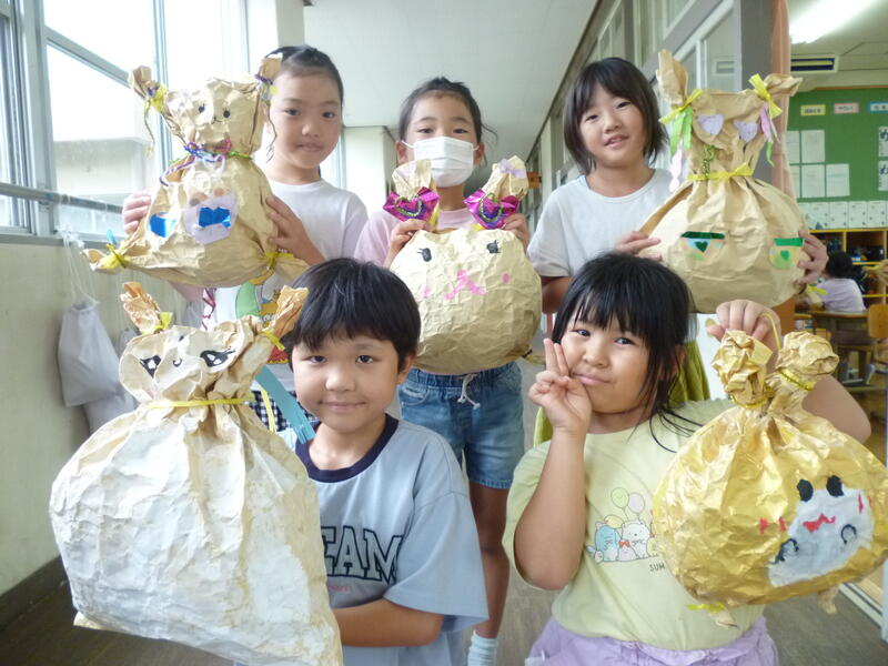 2年生は生活科でおもちゃ作りをしました。身近にある物を使って動くおもちゃを作り、遊ぶ活動を通して、試行錯誤をくり返しながら遊びを工夫し、みんなで遊びを楽しんだり創り出したりするのがねらいです。完成後、さっそく遊んで楽しみました。次は、1年生を招待して遊んでもらうので、ルールを考えて必要なものを準備していきます。みんなはりきっています。