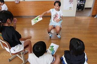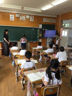 作文を発表しているところです。「どうぶつえんのじゅうい」という単元で、「〈前略)いつか、いっぱいの動物にえさをあげたり、体をあらったりするおせわをしたい。」と、発表しました。みんなは、作文が映されたプロジェクターを見ながら、一生懸命に聞いてくれました。
