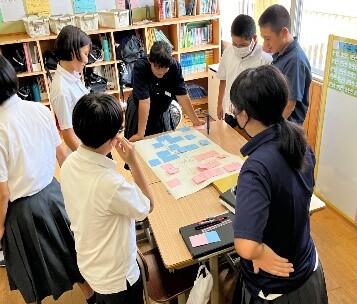 中学1年生の総合的な学習の時間で、『幸せな世界』について考えました。子どもたちは幸せな世界を「〇〇がある世界」「〇〇がない世界」という形でたくさん付箋に書き出し、グループで関連する内容をまとめてマインドマップを作成しました。その後、世界で起きている様々な問題を写真で確認し、国連が出しているSDGsの動画を視聴しました。そこから、自分たちの考えた『幸せな世界』とSDGsの関係性について考えていきました。以下、子どもたちの活動の様子の一部です。