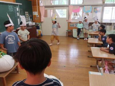 約2年間お世話になったALTのアイコ先生との最後の授業がありました。前回の授業でお別れ会を計画しました。アイコ先生との最後の楽しい思い出を作るために、子どもたちは、この日まで手紙やイラストなど準備を一生懸命してきました。お別れ会では、椅子取りゲームとジェスチャーゲームを行い、最後に手紙とイラストをプレゼントしました。