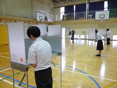 実際に使用されている投票箱、記載台を北方総合支所からお借りし、投票に使用しました。生徒は皆、演説会から投票まで、真剣な態度で話を聞き、投票を行うことができました。選挙を無事に終えることができたのも、選挙の準備から運営を担った3年生の選挙管理委員会のおかげです。選挙管理員会の生徒の皆さんお疲れ様でした。