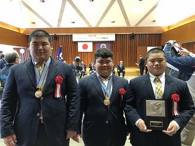 北方学園から相撲部の3人が、個人戦及び団体戦において県や全国の舞台で優秀な成績を修めたとして、この授賞式に参加しました。