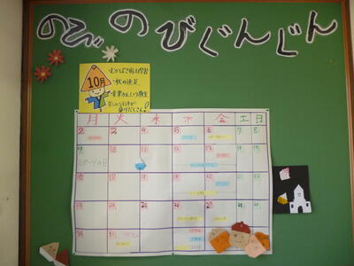 4月から継続して取り組んでいるこの活動ですが、特に10月は学校行事や各学年ならではの校外学習も多いため、毎日、今日の予定を確認することで、見通しをもって生活できるようにすることがねらいです。学年ごとに色分けをして行事を書き出し、自分たちにとってわかりやすいカレンダーになるよう工夫しています。