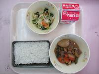 今日はドライカレーについてのお話です。ドライカレーは、日本独自のカレー料理の一つです。チャーハンのように具とご飯を炒めてカレー味にしたものや、ひき肉と細かく切った野菜をカレー味にしてご飯にのせて食べるものなどの総称です。普通のカレーと大きく違うところは、その名の通り水分が少ない(ドライ)なことです。みなさんが大好きなカレーですが、一食の栄養価を考えると、どうしても足りない栄養素が出てきます。そこで今日の給食では、ドライカレーの中に大豆を入れたり、組み合わせたスープの中には野菜をたくさん入れました。