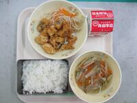 ヤンニョムチキンとは、揚げた鶏肉に甘辛いソースの「ヤンニョム」をからめた韓国のフライドチキンです。韓国料理はキムチなどで唐辛子をよく使うことから、辛い料理が多いという印象があります。ですが、今日の給食ではコチュジャンの他に、濃口しょうゆ、砂糖、ケチャップなどの調味料を使って辛さ控えめの味つけをしました。