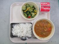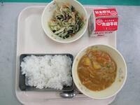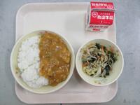 今日は中学1年生がリクエストしたカレーと海藻サラダです。給食に   出しているカレーは、お店で売っているような「カレールウ」は使いません。お店で売っているカレールウには、甘味料や添加物を加えて味の特徴を 出したり、保存性を高めるものが入っているものもあります。給食ではマーガリン、小麦粉、カレー粉を使ってルウを手作りしています。調理員さんが大きな釜の中で焦がさないように、ずっと混ぜ続けながら作っています。お店のカレーとはひと味違った手作り給食のカレーも味わって食べてください。