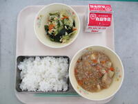 今日は中学1年生のリクエスト献立、シチューです。シチューに入っている牛乳はカルシウムが豊富です。小魚や小松菜などの青菜にも多く含まれていますが、牛乳はカルシウムの吸収率が高いという研究結果があります。成長期は骨や歯の成長にカルシウムが多く必要になるので、カルシウムの補給に便利です。